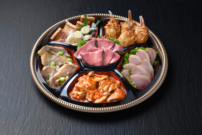 蟹爪フライ/合鴨ロースト/ローストビーフ/サーモンのマリネ/カレイのポワレ/チキントマト煮込み